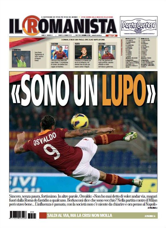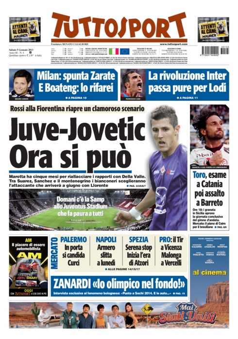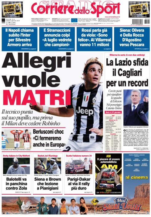 Più realistico è invece il Corriere dello Sport che vede Matri nell’attacco rossonero, più che Balotelli. Ringalluzzito dall’affare-Rossi è invece Tuttosport che vede l’arrivo di Pepito in viola come il trampolino per la partenza di Jovetic. Ovviamente direzione Juventus. Non parla di acquisti invece il Romanista visto che il principale colpo di mercato di gennaio dei giallorossi è mantenere in casa tutti i suoi giocatori migliori. Stavolta è il turno di Osvaldo che sancisce definitivamente di voler rimanere nella Capitale e chiude ad ogni trattativa. Questi ed altri spunti per la giornata sportiva nelle prime pagine dei quotidiani di oggi.