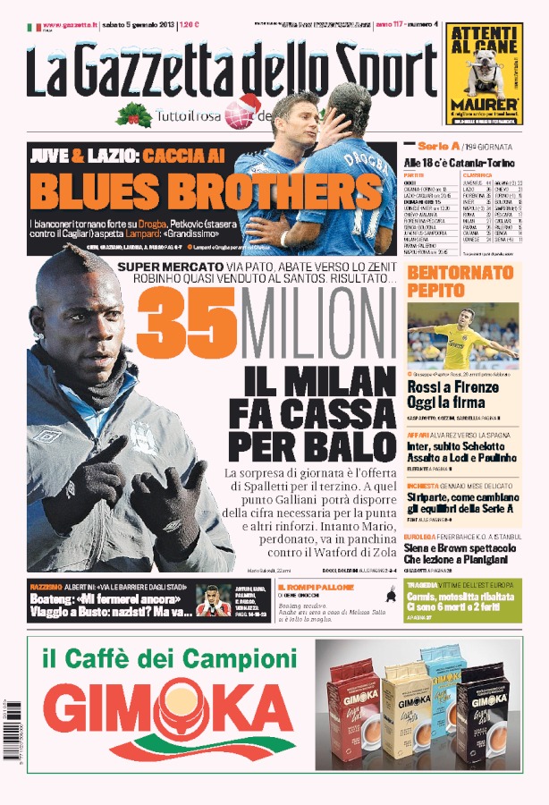 Il mercato comincia a farsi rovente, ed anche la fantasia dei tifosi. E perché no, pure di quella di alcuni giornalisti. Questa mattina è la Gazzetta dello Sport quella che la spara più grossa. Secondo la Rosea, stando alla sua prima pagina, dopo che il Milan avrà venduto Pato, Robinho e Abate, avrà quei 35 milioni che servono per arrivare a Balotelli. I conti sono stati fatti piuttosto male, non si arriva nemmeno a 30 milioni, ma resta sempre da convincere lo sceicco che di disfarsi di Supermario proprio non ne vuole sapere.