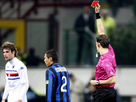 Si conclude senza vincitori né vinti il secondo anticipo della venticinquesima giornata di campionato tra Inter e Samp, al termine di una gara oltremodo nervosa, caratterizzata da ben tre esplusioni e da un gioco praticamente assente da una parte e dall’altra. Nella prima mezz’ora di gioco entrambe le squadre hanno fatto ben poco per portare a casa i tre punti, ma poi è salito in cattedra l’arbitro Tagliavento, che prima ha sventolato il cartellino rosso sulla faccia di Samuel (gomito alto su Pozzi lanciato a rete), poi ha ammonito per la seconda volta Cordoba, lasciando così i nerazzurri in nove uomini.