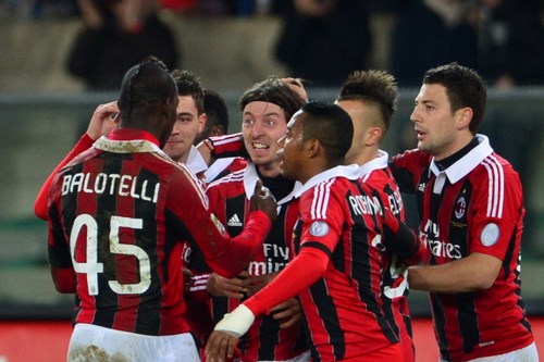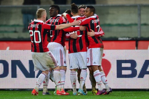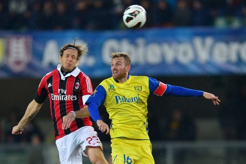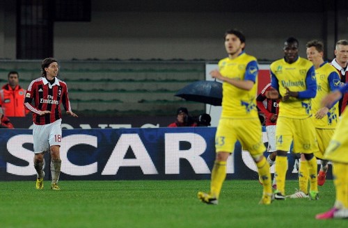 Prova di sostanza per il Milan su un campo reso difficile dalla pioggia. Il Chievo cade per una rete di Montolivo al venticinquesimo del primo tempo, per un successo che permette ai rossoneri di portarsi momentaneamente a +1 sul Napoli, ma soprattutto a +6 sulla Fiorentina. Il vero protagonista delle prime fasi di gioco è il campo inzuppato dalla pioggia che è caduta incessantemente su Verona, con le fasce praticamente zeppe di pozzanghere. Per il Milan risulta quindi difficile far valere la sua tecnicità. Prima occasione per il Chievo al 14′, ma Abbiati è attento su palla deviata. Al 25′ l’episodio che decide il match: violenta punizione battuta da Balotelli, Puggioni si oppone con una respinta, ma arriva Montolivo per il tap-in vincente. Il gol segnato galvanizza i rossoneri che ci provano ancora con Balotelli su punizione: Puggioni attento.