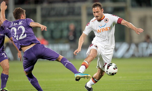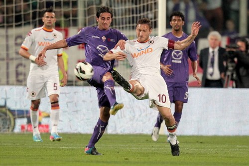 Il primo tempo è stato generalmente più equilibrato, anche se la supremazia territoriale da parte dei viola è evidente. La prima occasione è per Totti su calcio di punizione, con pronta respinta di Viviano. Poi, esce la Fiorentina che prova subito a trovare il vantaggio con Jovetic, Ljajic e ancora il montenegrino, che è sfortunato a colpire il palo a cinque minuti dall’intervallo. Per gli ospiti, l’unico sussulto è una conclusione debole di Osvaldo.