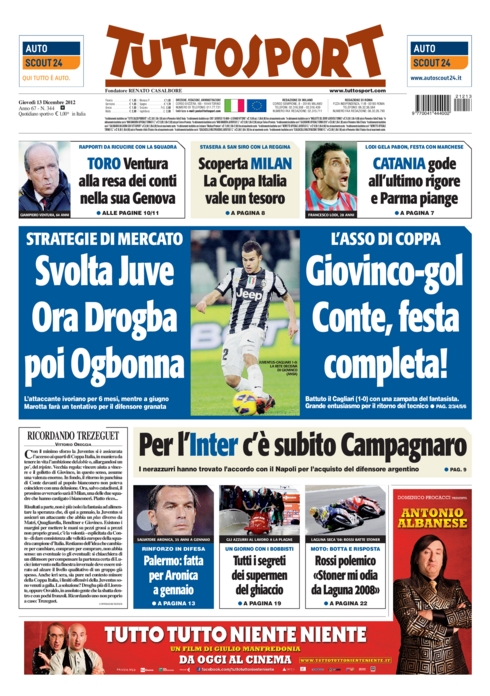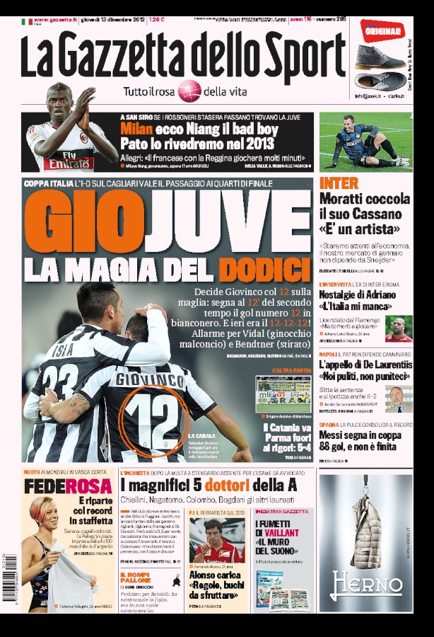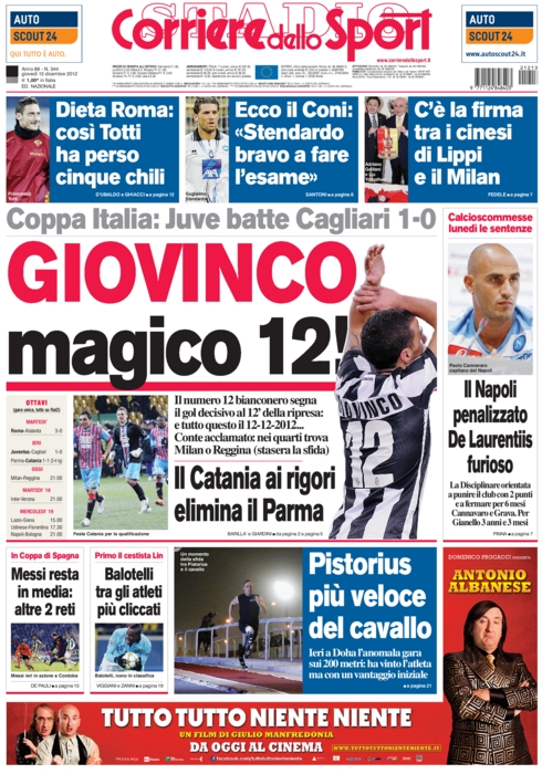 La mania del numero 12 ieri ha contagiato tutti, persino il calcio. Nella data del 12/12/2012, chi poteva segnare il gol decisivo, se non Giovinco, il numero 12? Per di più al 12′, seppur del secondo tempo. Questa strana combinazione ha lasciato strabiliati tutti, e così i quotidiani sportivi non potevano lasciarsela sfuggire. Aprono oggi sottolineando questo fenomeno sia la Gazzetta che il Corriere dello Sport, mentre Tuttosport si gode la vittoria e basta.