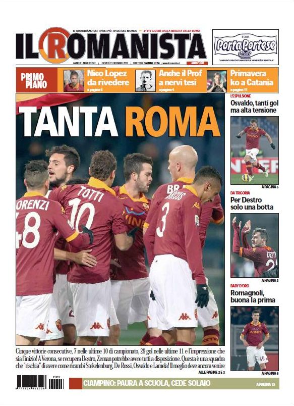 Le altre notizie che ci accompagneranno per il resto della giornata riguardano la Coppa Italia (il passaggio di ieri del Catania e la sfida del Milan contro la Reggina) ed il calciomercato, con le manovre delle principali squadre italiane. Concludiamo la nostra rassegna stampa con la parentesi giallorossa, con il Romanista che gongola ancora dalla vittoria di martedì scorso, ma che analizza più a mente fredda la situazione della squadra, con Nico Lopez “da rivedere” ed alta tensione per quanto riguarda Osvaldo. A voi le prime pagine di oggi.