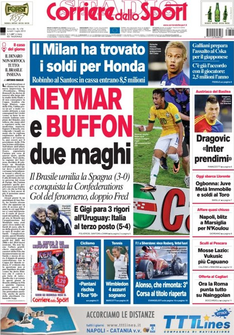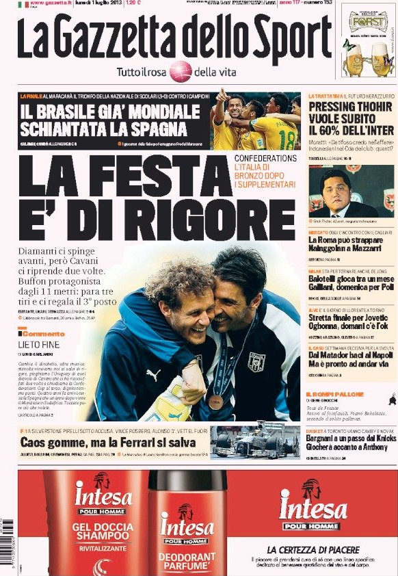 L’Italia vince ai rigori (e già questa è una notizia) e si prende la consolazione di vincere la medaglia di bronzo alla Confederations Cup. Una medaglia che da un lato ci dà la soddisfazione di aver vinto la finalina, ma dall’altra dà anche una certa amarezza perché, vedendo come ha perso male la Spagna, ci fa pensare che forse gli azzurri contro il Brasile avrebbero potuto fare qualcosa di più. Ad ogni modo sulle prime pagine di oggi si festeggia soltanto, e allora va bene così.