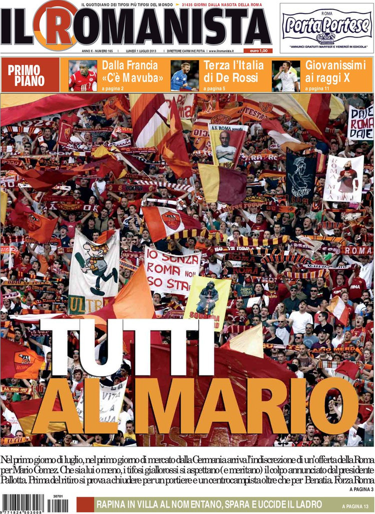 Se il Milan ride, l’Inter non può fare altrettanto. Thohir rilancia e dice che o Moratti gli vende il 60% del club (nei giorni scorsi si era parlato del 40) o non se ne fa niente. Rimane così in stand-by l’affare Dragovic, e di conseguenza la Roma ripassa in vantaggio per Nainggolan. Una Roma che fa sul serio ed oggi, secondo il Romanista, punta in alto, direttamente su Mario Gomez. Ma di notizie di mercato oggi ce ne sono davvero tante, quindi vi lasciamo alle prime pagine dei quotidiani sportivi.