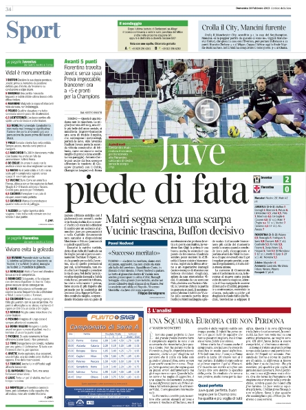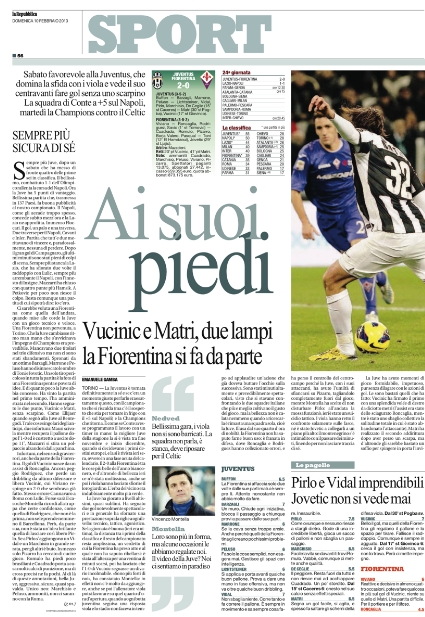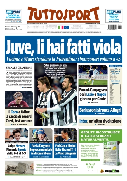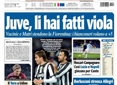 La Juve vola e anche i giornali sportivi le danno merito. La vittoria contro la Fiorentina di ieri, unita al pareggio del Napoli, fanno dei bianconeri i protagonisti di giornata, con la rete di Matri senza lo scarpino sbattuta in prima pagina un po’ ovunque. Certamente questa è la notizia più importante perché di fronte a questa impresa le altre news passano in secondo piano. Anche se c’è Berlusconi che ne spara una delle sue.