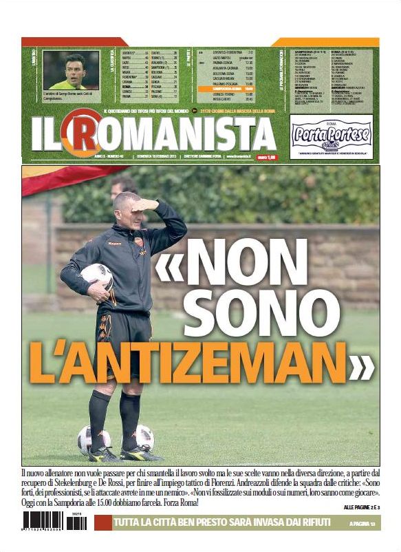 Leggendo i giornali di oggi non si capisce nemmeno contro chi gioca il Milan, ma si capiscono solo due cose: che ci sarà Balotelli e che il presidente rossonero ha detto che Allegri “non capisce un c…”. Un bel modo di spronare la squadra, non c’è dubbio. Dato che tutti i giornali parlano solo di questi due aspetti del calcio italiano, passiamo direttamente a il Romanista che apre con le parole di Andreazzoli che non vuol essere considerato l’anti-Zeman perché a lui piace costruire una squadra e non sfasciare il lavoro degli altri. Resta da capire se la società gli concederà il tempo per farlo. A voi le prime pagine di oggi.