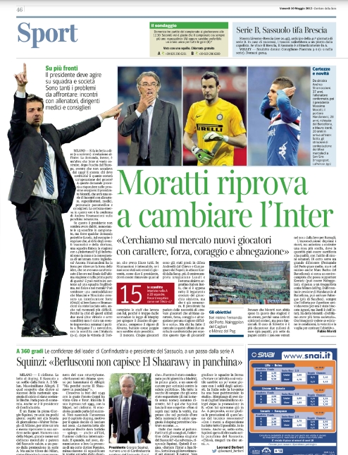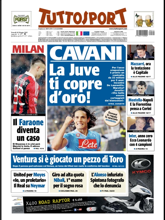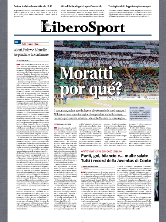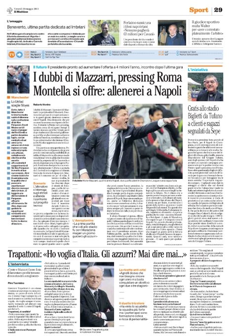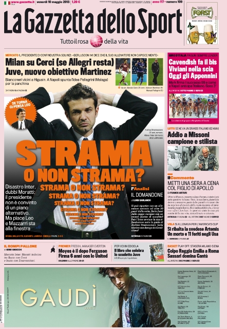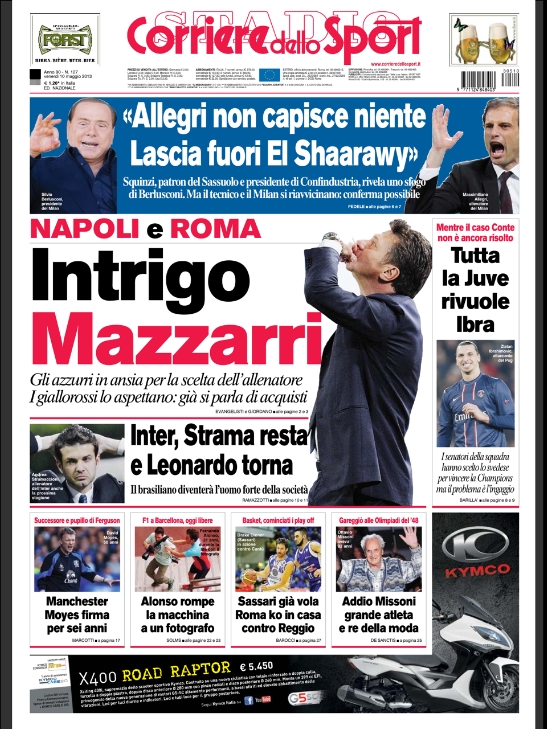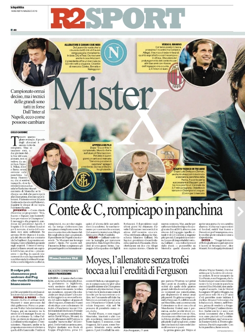 Archiviato il campionato, è troppo presto per parlare concretamente di mercato, e così tutte le attenzioni si spostano sulle panchine. Dopotutto non è solo un problema italiano se i giornali internazionali parlano del cambio di allenatore in club come Manchester United, Real Madrid e Chelsea. Da noi tengono banco Roma, Napoli, Fiorentina, Milan e Inter, con problemi di diversa natura. Come sottolineano la gran parte dei quotidiani italiani oggi, tutto sta nelle mani di Mazzarri.