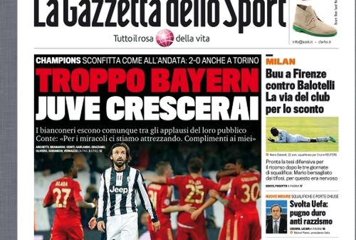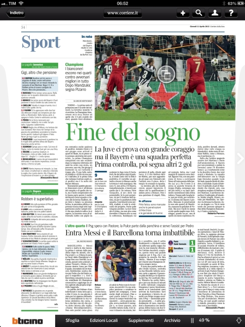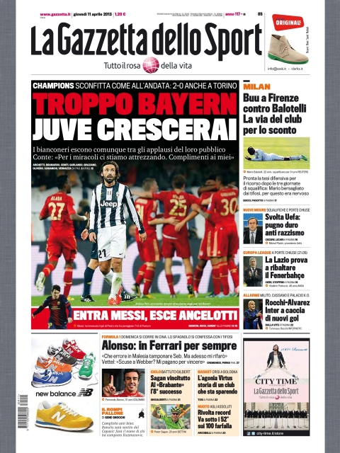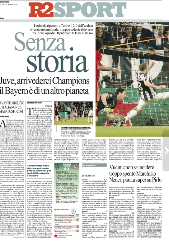 L’impresa non è arrivata, il Bayern è troppo forte anche per la Juventus, e allora bisogna rimandare all’anno prossimo i sogni Champions. La Juve esce sconfitta anche sul suo campo e tutti i giornali concordano col dire che è vero che il risultato dice nel complesso 4-0 per i tedeschi, ma è vero pure che i bianconeri non hanno demeritato e che sono in crescita. Manca solo quella maturità, e magari quel fuoriclasse alla Robben, che in campo europeo fa la differenza.