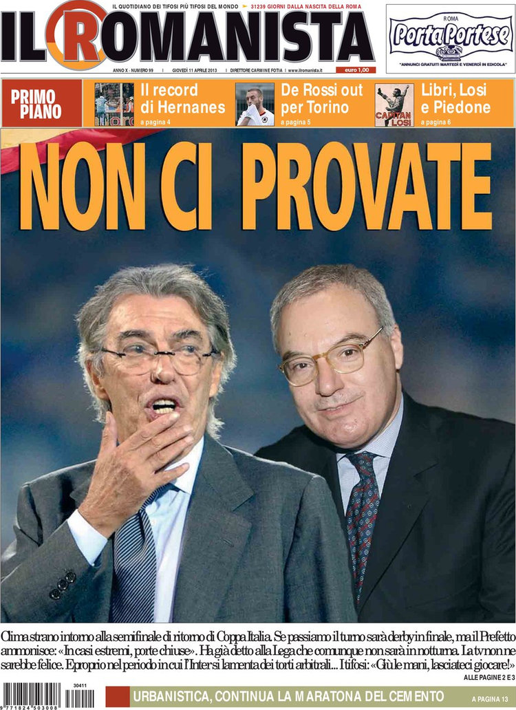 Ma attenzione anche alla Roma che lancia l’allarme. Si sta creando un clima ostile intorno alla semifinale di Coppa Italia con l’Inter in quanto, in caso di passaggio del turno, la finale sarebbe proprio il derby, e dopo gli scontri di lunedì scorso non lo si vorrebbe far giocare di sera. Allora il sospetto che il Romanista mette in campo è che si farà di tutto per farci arrivare l’Inter in finale, storicamente società gemellata con i biancocelesti, per trascorrere una serata tranquilla. Speriamo siano solo supposizioni e nulla di più.