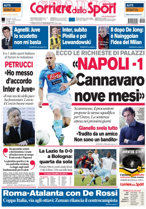 L’11 dicembre non è una data che ha un evento sportivo principale. E’ il giorno in cui le grandi del calcio italiano aprono la Coppa Italia (si comincia oggi con la Roma, come sottolinea il Romanista), ma inevitabilmente si ricomincia a parlare di mercato. Ma forse più di tutto ad attirare le attenzioni è la vicenda del Napoli che rischia un punto di penalizzazione per la vicenda scommesse.