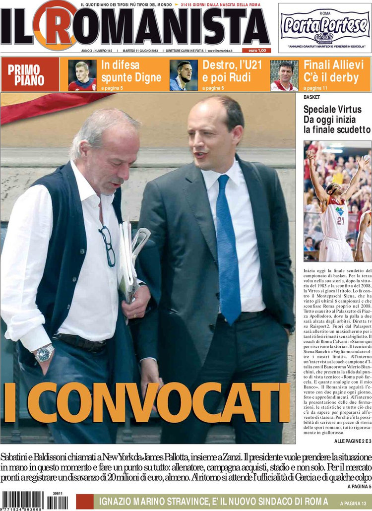 La sua società intanto sembra aver scelto Rudi Garcia, anche se per l’ufficialità ci vuole ancora qualche giorno per noie burocratiche con il Lille, mentre per il mercato bisognerà ancora attendere visto che solo oggi sono attesi i principali dirigenti negli USA a rapporto da Pallotta che devono stilare il piano per i prossimi anni. Questo ed altro nelle prime pagine di oggi.