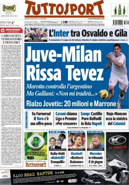 Per questo oggi i principali giornali italiani aprono con una disputa che probabilmente non vedrà mai un vincitore. Risolto il caso Thohir, l’Inter si rituffa sul mercato e così, oltre alle trattative annunciate ieri, oggi secondo il Corriere dello Sport avrebbe puntato un nuovo attaccante. Si tratta di Osvaldo che Mazzarri voleva già ai tempi di Napoli, e che ora ritiene possa essere la punta della svolta. L’italo-argentino sembrava destinato alla Liga, ma il fatto che ancora non abbia trovato nessun accordo fa pensare che probabilmente c’è più di un problema che lo trattiene a Roma.