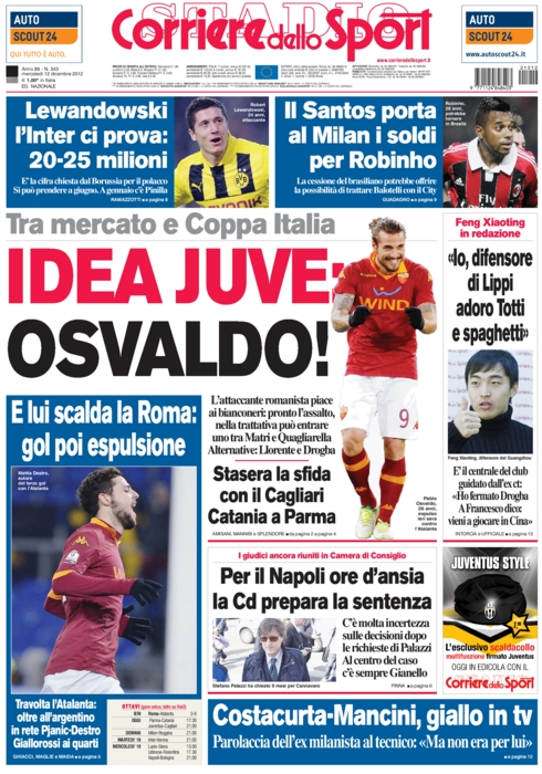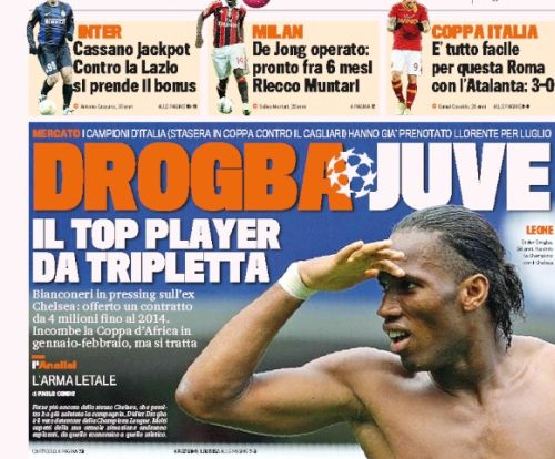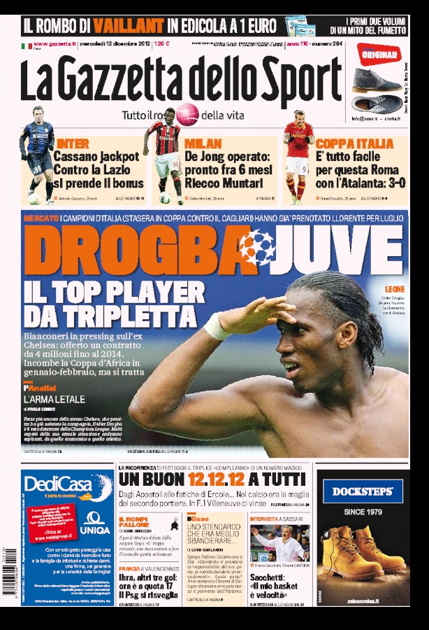 Sono i grandi nomi quelli che vendono (ed anche quelli che chiede il tecnico) e allora ecco che per la Gazzetta l’acquisto della Juve di gennaio sarà Didier Drogba, per il Corriere è Osvaldo e per Tuttosport può essere chiunque, basta che si tratti di un nome importante. C’è un piccolo spazio anche per le altre squadre, con i guai del Milan (da una parte l’infortunio di De Jong che ha già concluso la stagione, dall’altra l’assalto del Santos a Robinho), i tentativi dell’Inter su Pinilla e Lewandowski, e perché no, anche per l’impresa della Roma. L’unico a metterla a piena pagina è ovviamente il Romanista che festeggia la sua “cinquina”. A voi le prime pagine dei giornali di oggi.