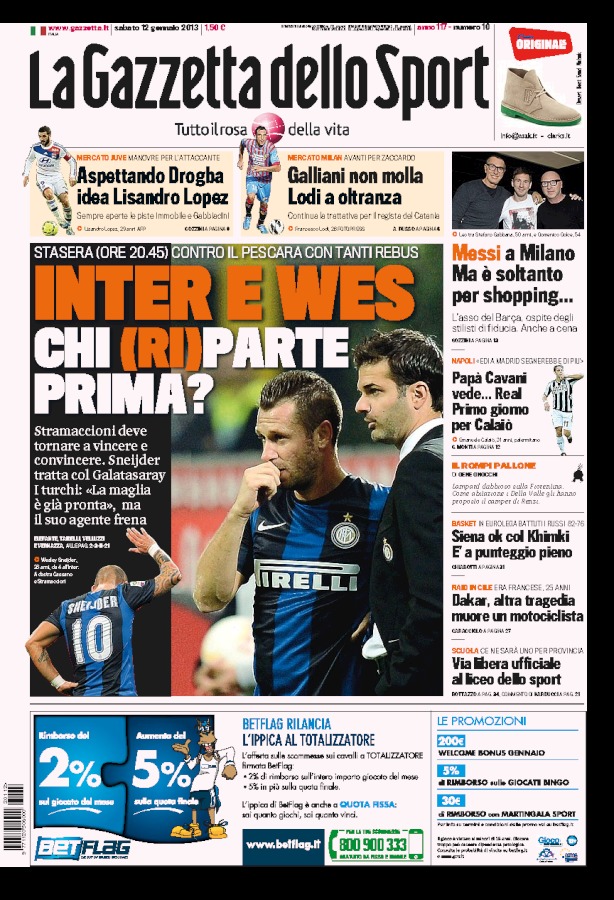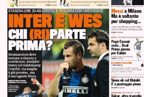 E’ una giornata molto variegata quella che ci prospettano i quotidiani sportivi di oggi. Ce n’è per tutti i colori, letteralmente parlando. Cominciamo con chi di colori ne ha più di tutti, la Gazzetta dello Sport, che apre con un dubbio: chi (ri)parte prima, Sneijder o l’Inter? Ieri la firma col Galatasaray è saltata, ma si tratta ancora. Potrebbe arrivare a ore però.