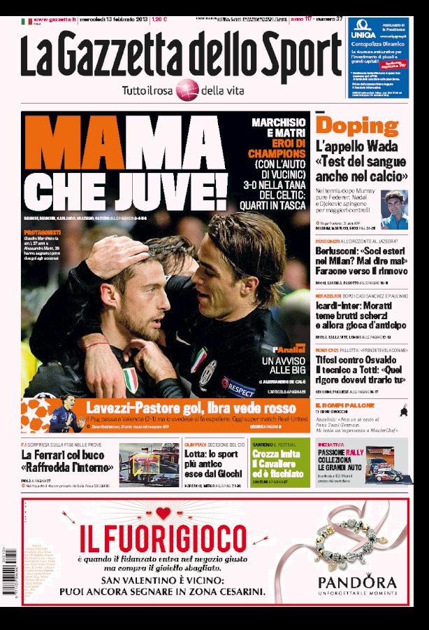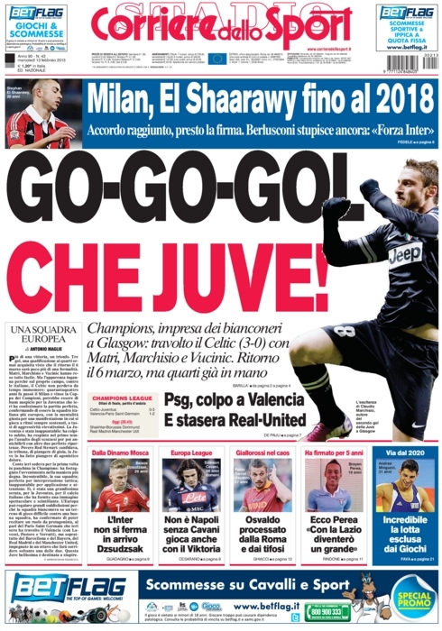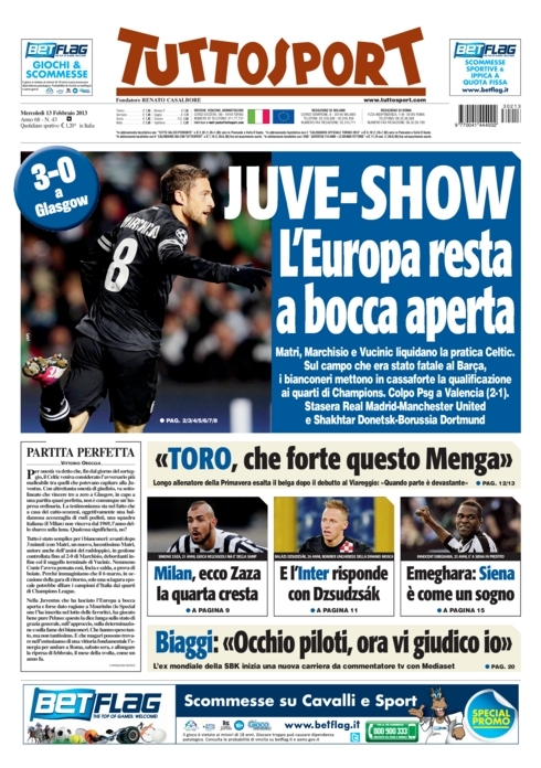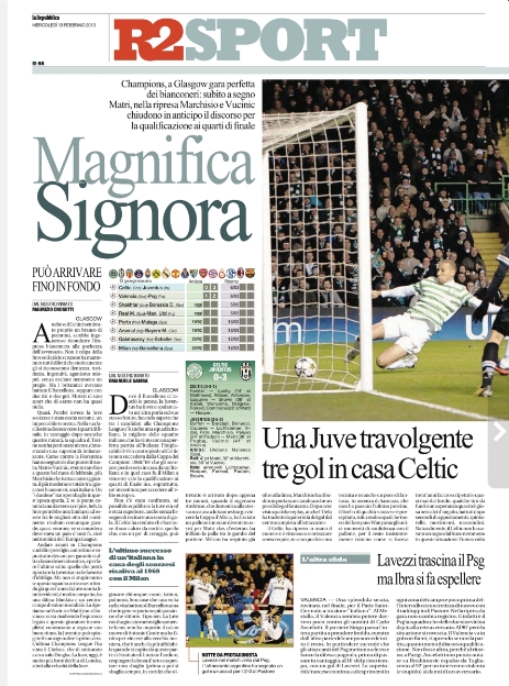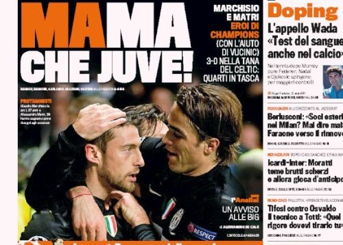 L‘impresa di ieri sera della Juve non poteva non essere l’apertura di tutti i giornali sportivi di oggi. A parte i quotidiani stranieri, i quali si concentrano più sulla super sfida di stasera tra Real Madrid e Manchester United che sulle gare di ieri, per quanto riguarda quelli italiani c’è un unico coro in favore dei bianconeri. Sì perché nonostante il risultato racconti una storia diversa, l’impresa è stata tutt’altro che semplice, e permette di affrontare la gara di ritorno con più tranquillità.
