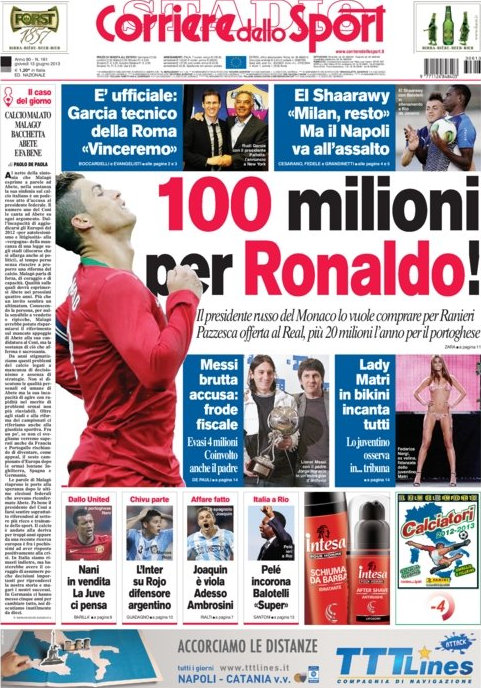 Anche il Milan sta pianificando grossi cambiamenti e sta pensando seriamente di cedere El Shaarawy per strappare l’Apache alla Juve, ma anche per far tornare un grande ex che non ha mai nascosto il suo amore per il Milan, ovvero Thiago Silva. La Roma intanto presenta il suo nuovo allenatore, Rudi Garcia, che come i suoi predecessori promette mari e monti. Gli auguriamo di avere un destino diverso dagli altri.