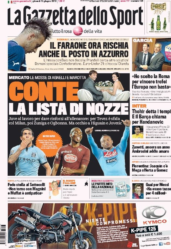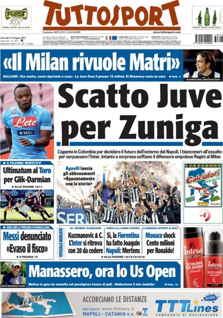 Dopo settimane di “occupazione” delle prime pagine da parte del Milan, è la volta della Juventus che cerca di concludere le varie trattative che sta portando avanti da tempo. Secondo Tuttosport si è aggiunto un nome nuovo all’elenco, quello di Zuniga, il quale potrebbe essere l’esterno mancino che manca ai bianconeri. Ma attenzione anche al ritorno di Nani che secondo i tabloid britannici potrebbe costare ancora meno rispetto al passato, solo 10 milioni, più tutti gli altri obiettivi per cui si tenta di arrivare ad una firma in tempi brevi come Ogbonna e Tevez.