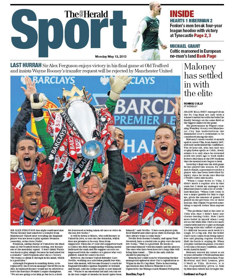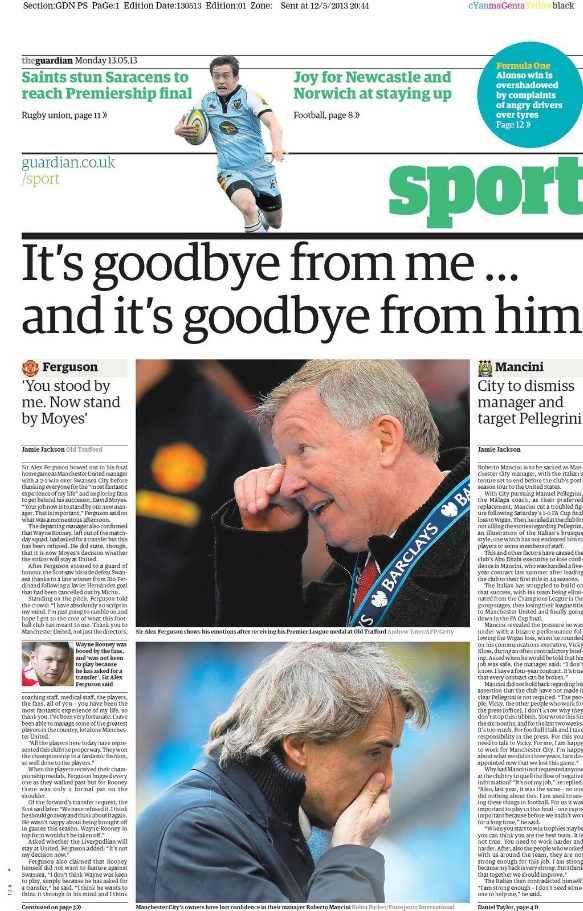 Fuori dall’Italia invece la festa la fanno in tanti. Uno su tutti è Alex Ferguson che alza al cielo la sua ultima coppa, prima del ritiro. Tutte le prime pagine dei tabloid sono dedicate a lui, al sergente di ferro in lacrime dopo una vita passata nel calcio. Semmai si trova costretto a condividere la ribalta con un altro allenatore, Roberto Mancini, che pure lascia, ma con un’atmosfera decisamente diversa. L’allenatore italiano è infatti ufficialmente esonerato ed al suo posto arriverà la prossima settimana Pellegrini. Tra le varie feste, segnaliamo anche quella del Barcellona.