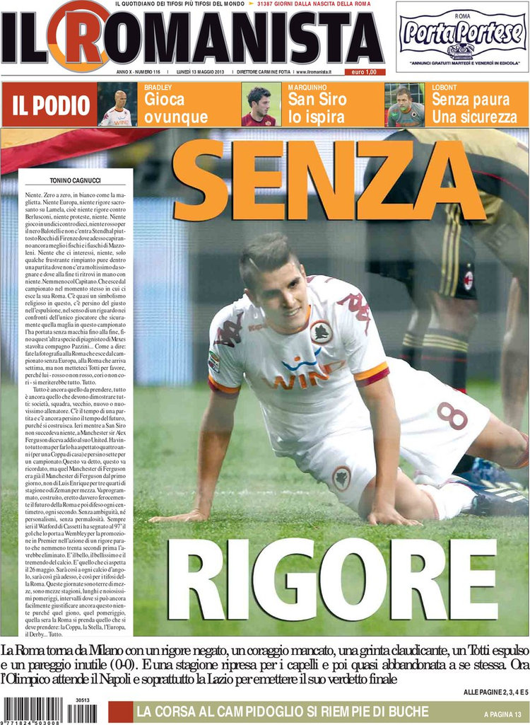Milan e Roma pareggiano 0-0 e sui giornali è tutto tranne che festa. I rossoneri infatti rimandano la matematica certezza della Champions League, i giallorossi invece dicono addio alla qualificazione europea per la posizione in campionato e possono soltanto sperare nella Coppa Italia. Un po’ tutti i giornali, dal Corriere dello Sport fino a il Romanista parlano di delusione. Una delusione acuita anche dal fatto che al contrario la Lazio va forte e si giocherà il quinto posto con l’Udinese fino all’ultimo minuto dell’ultima giornata.