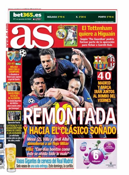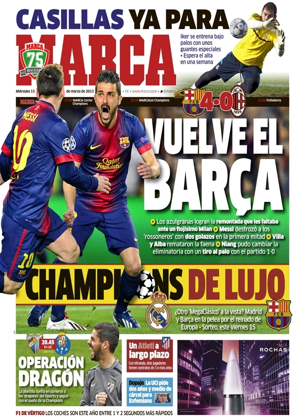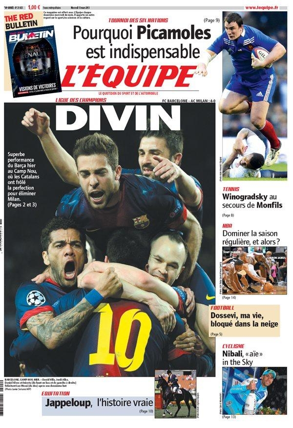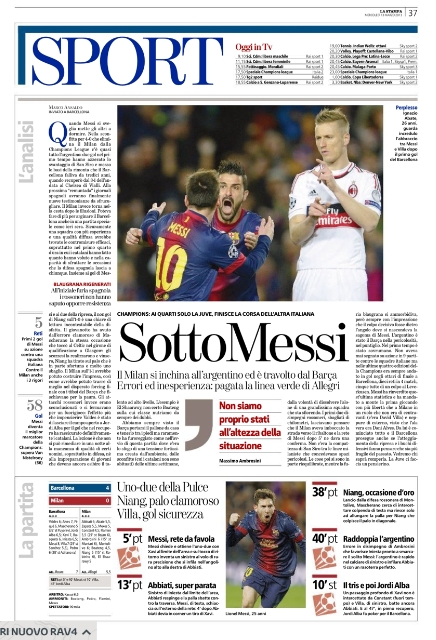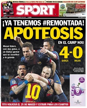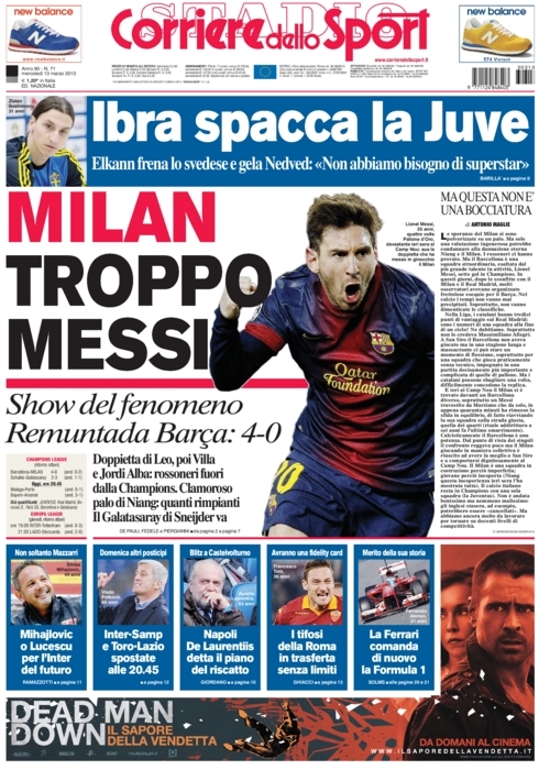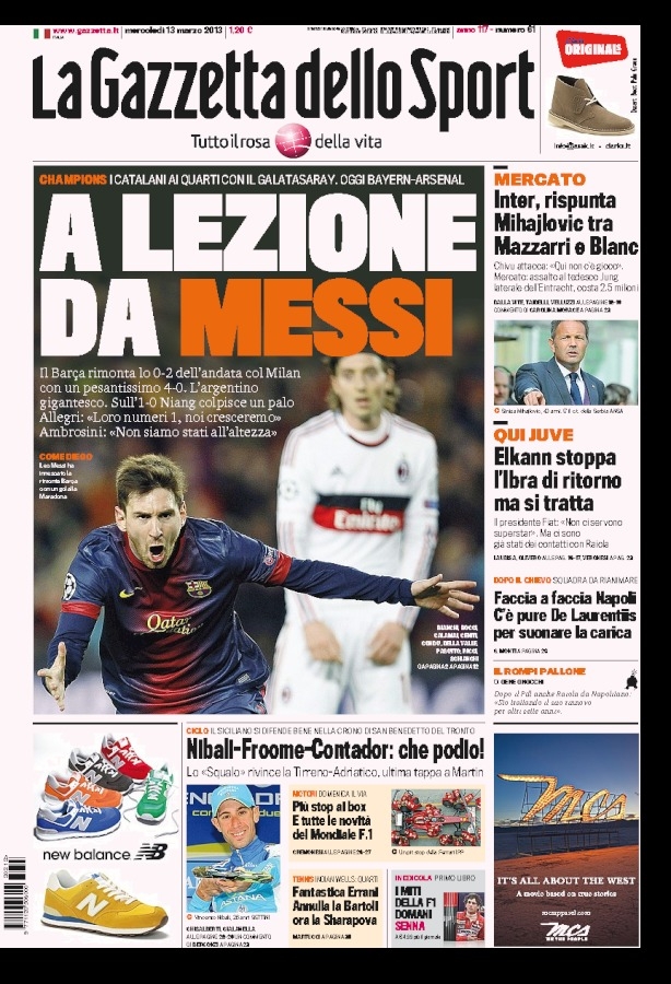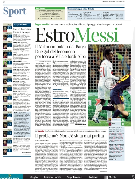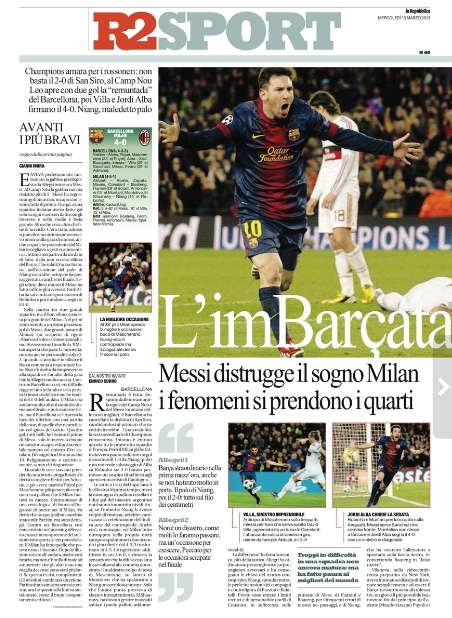 Non potevano essere diverse le prime pagine di oggi. Tutta Europa apre con la Remuntada di Messi e compagni, e con il tracollo del Milan, una squadra troppo piccola per competere con dei mostri del genere. C’è poco da dire in questa giornata dove l’unico gioco divertente è scovare i titoli più curiosi. Si va così dallo scontato “Sotto-Messi” della Stampa all'”Estro-Messi” del Corriere della Sera, fino alla “Im-Barca-ta” di Repubblica. Insomma, tutti elogiano la Pulce e deridono i rossoneri.