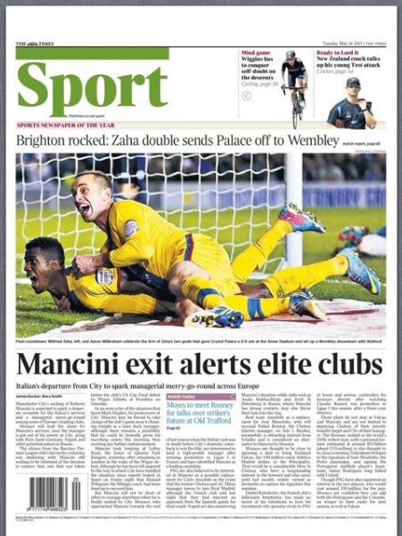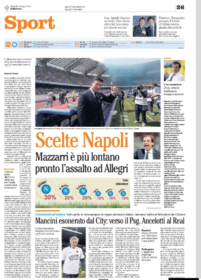 Le prime pagine di oggi sono tutte dedicate ai mille cambi di panchina di queste settimane. Li inaugura Roberto Mancini, questa notte ufficialmente esonerato dal Manchester City e sostituito temporaneamente da Kidd prima dell’arrivo di Pellegrini. Il Mancio però non si dispera dato che va via con una buonuscita da 7,5 milioni di euro ed ha già pronta una panchina, quella del PSG nel caso in cui Ancelotti andasse al Real Madrid.