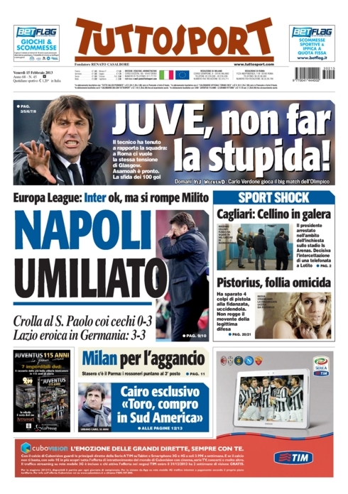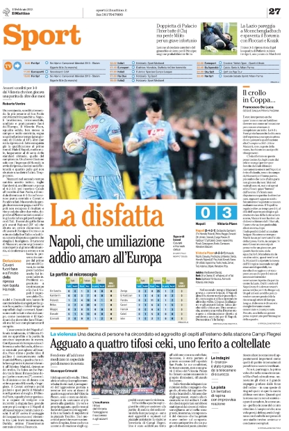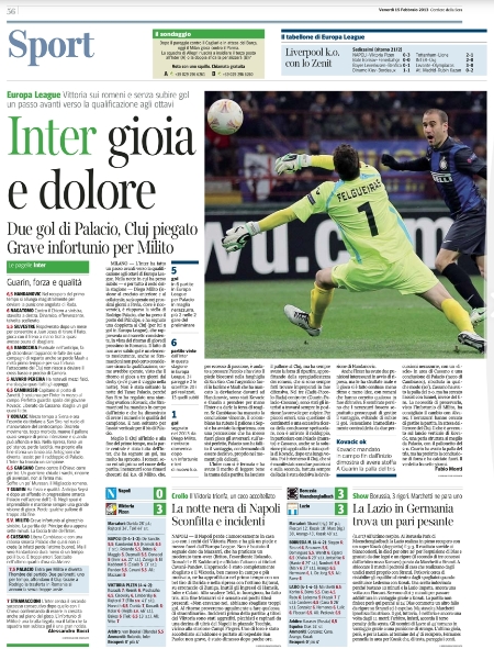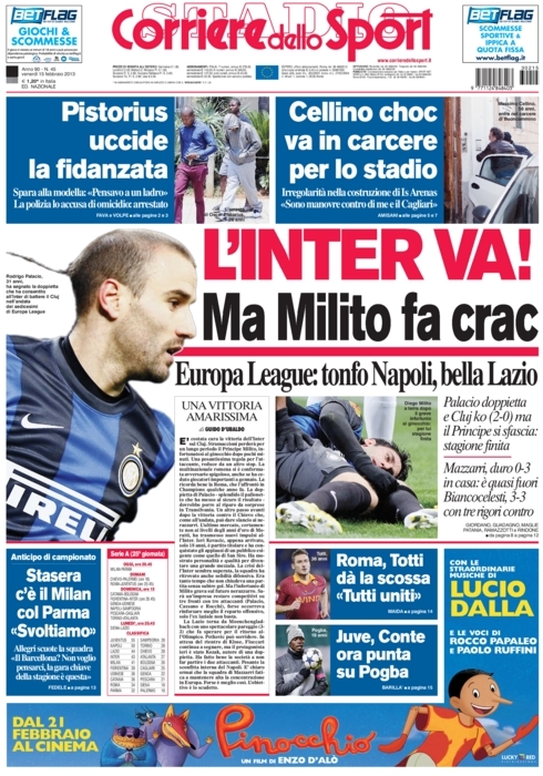 Come se non bastasse ad oscurare le prestazioni dell’Inter e della Lazio (sorvoliamo sul disastro del Napoli) ci si è messo pure Cellino, arrestato per lo scandalo che ha riguardato lo stadio Is Arenas. Insomma, la giornata di ieri è da cancellare un po’ per tutti. Lo è certamente per il Napoli, con il quotidiano di casa, il Mattino, che parla di disfatta ed umiliazione, ma lo è anche per l’Inter che, nonostante abbia vinto contro il Cluj, dovrà fare a meno per tutta la stagione, e forse per sempre, di Diego Milito che si è rotto un ginocchio.