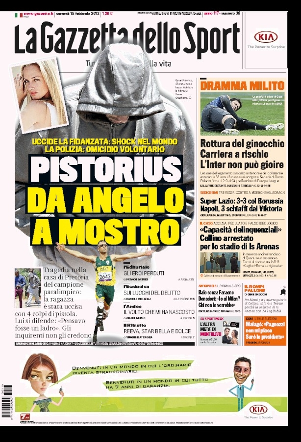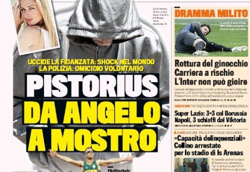 L’apertura di quasi tutti i giornali di oggi è molto triste. Anche se su questo blog ci occupiamo di calcio, non possiamo far finta di nulla di fronte al dramma che ha visto coinvolto ieri il noto atleta olimpico Oscar Pistorius. Non lo fanno nemmeno i grandi quotidiani mondiali, nonostante quella di ieri fosse una giornata di competizioni europee.