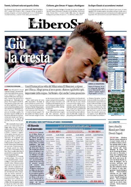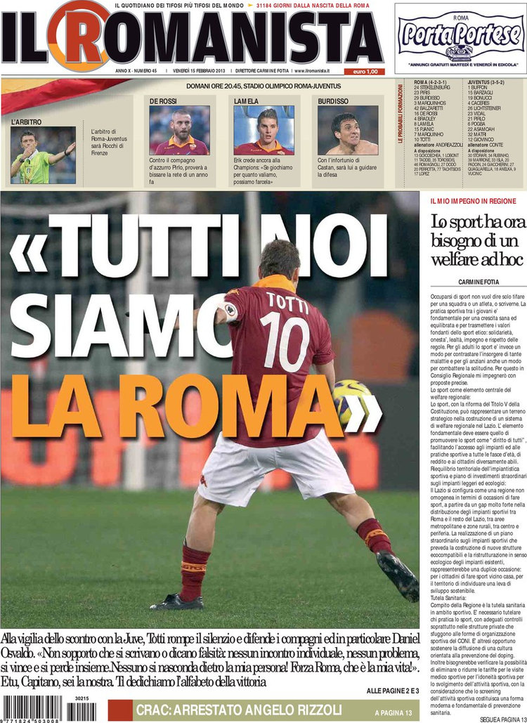 Di calcio giocato si parla poco ma se ne parla. Ad esempio sulle prime pagine di oggi si fa cenno al Milan, chiamato alla partita che delineerà il suo futuro in campionato questa sera contro il Parma, ma anche alla Juve che riparte da Pogba, e della Roma, con Totti che, ancora una volta, chiede unità alla squadra ma soprattutto all’ambiente intorno alla squadra, perché sparare a zero su Osvaldo può solo danneggiarla. Vediamo le prime pagine di oggi.
