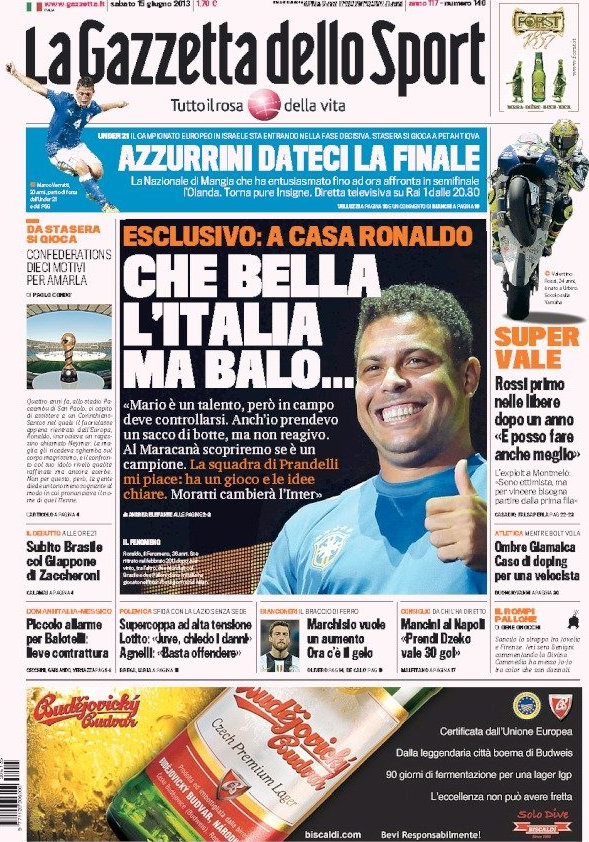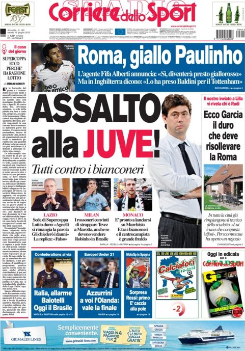 Ma come dice il Corriere, sembra che oggi ce l’abbiano tutti con la Juve. Non solo Marchisio, ma anche Lotito, Galliani ed il Monaco. Ma se la Juve piange, non ridono nemmeno gli altri grandi club. A quanto pare la Roma sarebbe in vantaggio sull’Inter per Paulinho, il giocatore seguito da quasi tre anni a questa parte, ma nelle ultime ore, come riporta sempre il Corriere, il Tottenham potrebbe battere tutti. Non ride nemmeno il Napoli, sempre più confuso sul caso Cavani, mentre il Milan oggi sulle prime pagine non si vede. Ma di carne al fuoco ce n’è già abbastanza. Senza contare che oggi comincia la Confederations Cup.