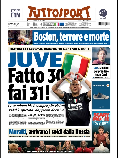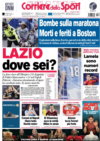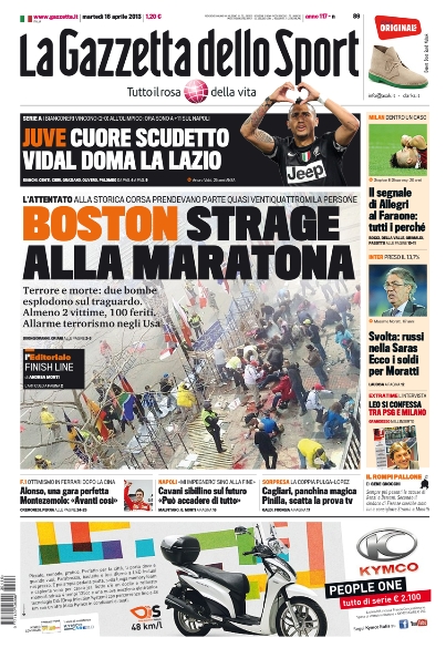 È doveroso aprire questa mattina con la strage di Boston. Ancor di più perché avvenuta durante una manifestazione sportiva. Tre morti e decine di feriti piange questa mattina l’America nel nuovo attentato su cui ora bisognerà fare chiarezza, ma su cui c’è chiaramente la mano terroristica. Resta da capire da parte di quale folle gruppo. Eppure è un peccato perché oggi avremmo potuto aprire con una mezza festa, quella della Juventus che, battendo la Lazio, si cuce il 31esimo (o 29esimo a seconda dei punti di vista) scudetto sulla maglia.