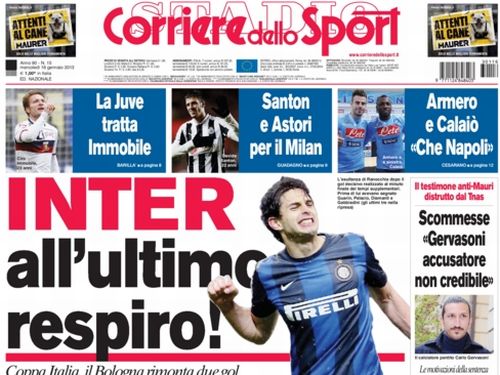 All’ultimo respiro. È stata questa la serata di ieri dell’Inter, col gol di Ranocchia che ha tolto le castagne dal fuoco a Stramaccioni, ed è proprio questa l’apertura dei due principali quotidiani sportivi che oggi titolano allo stesso modo. Una volta la Coppa Italia era snobbata, oggi non solo è molto sentita (in semifinale ci sono Lazio, Juventus, Inter e la quarta la conosceremo stasera, ma ci sono comunque due big), ma sorpassa in importanza anche il calciomercato. Anche perché pure il mercato è deprimente.