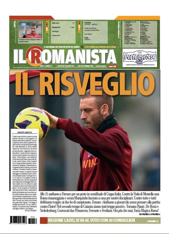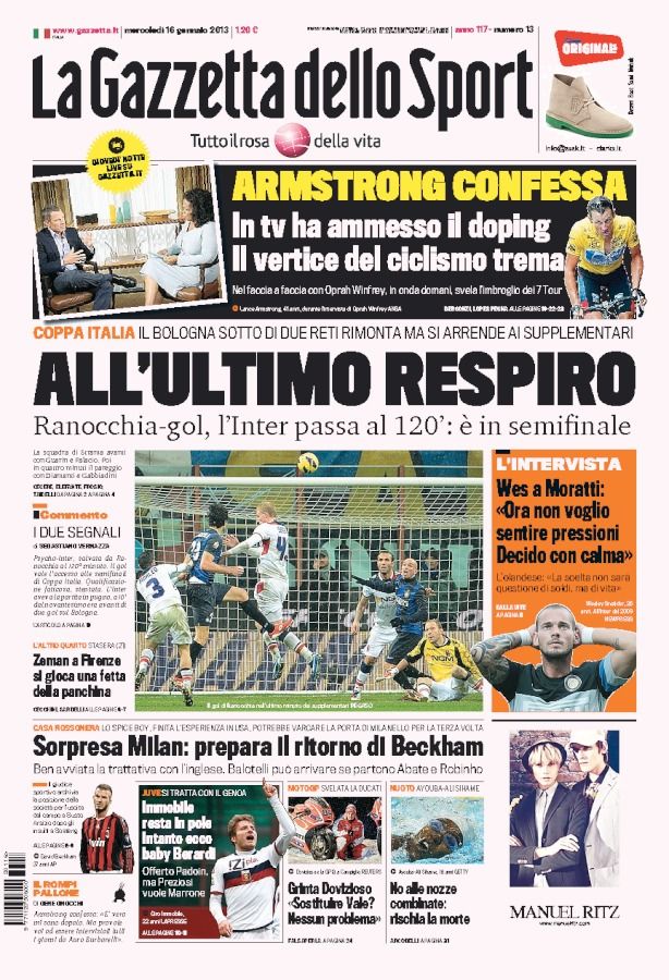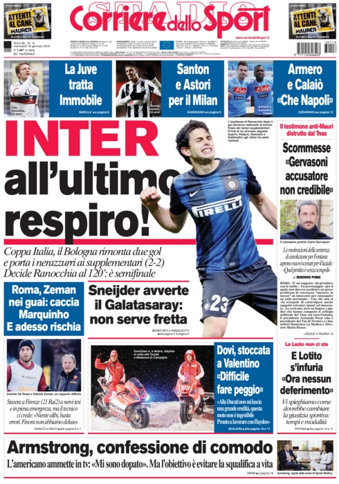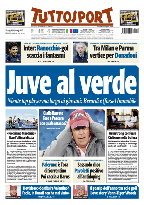 Avevamo cominciato bene facendo grandi nomi, ma ora per la Juve si parla di Immobile, e per Tuttosport pure del giovane Berardi; per l’Inter si parla solo della cessione di Sneijder, mentre per quanto riguarda il Milan si fanno solo cenni sottovoce a Santon, Beckham e Astori. Tant’è che diventa più importante l’ammissione del ciclista Armstrong di essersi dopato che le notizie del nostro mercato. Il Romanista carica la sua squadra, impegnata oggi nei quarti di Coppa Italia, ma soprattutto impegnata a riprendersi da un momento terribile che ha rimesso nuovamente Zeman in discussione.
