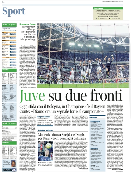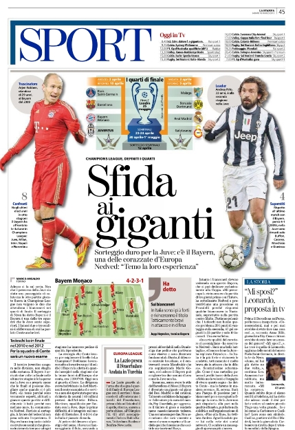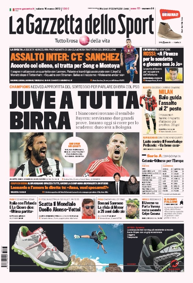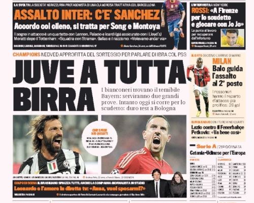 Ma c’è anche chi vede il Bayern come dei giganti, chi la vede come una sfida da brivido, chi lancia i bianconeri verso un futuro roseo con tanto di super campione (come Ibra), e chi invece la mette sullo scherzo, intitolando come la Gazzetta con un “a tutta birra”. Insomma, non ci si è sprecati. Tra le altre notizie del giorno spicca a sorpresa un gossip, ovvero la proposta di matrimonio in diretta di ieri di Leonardo alla giornalista Mediaset Anna Billò, mentre ritornando sul calcio giocato, la Gazzetta lancia oggi la bomba affermando che non solo l’Inter sarebbe interessata a Sanchez, ma che ci sarebbe persino l’accordo tra i club. Cerchiamo di capirne di più con le prime pagine di oggi.