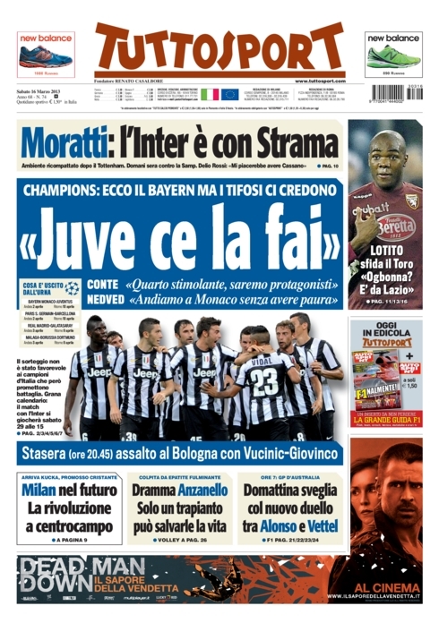 Juventus – Bayern Monaco è sicuramente la notizia del giorno. Questo incrocio pericoloso con una delle principali squadre europee stuzzica la fantasia dei tifosi e dei giornalisti che, due settimane prima della gara d’andata, cominciano ad analizzarla sotto tutti i punti di vista. Il sezionamento comincia ovviamente con Tuttosport che si limita ad incoraggiare i suoi beniamini, spingendoli con un semplice “Juve ce la fai”.