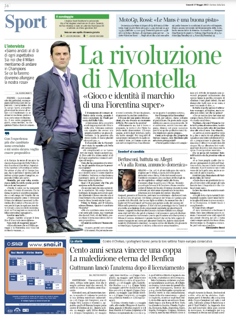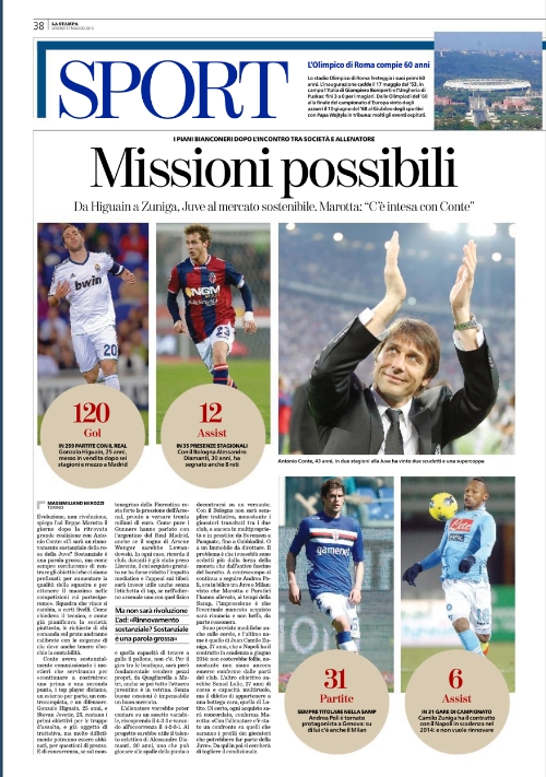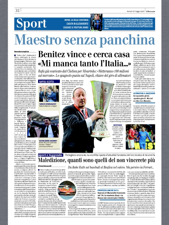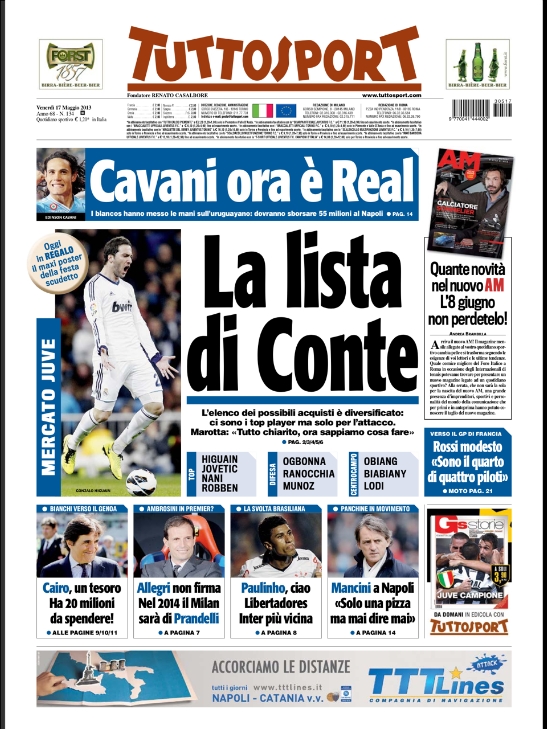 Ed è proprio il mercato l’altro punto dolente dei club di A. Su tutti attira le attenzioni Cavani che sembra sempre più vicino al Real Madrid, scatenando un effetto a catena che porterebbe Higuain alla Juve (ma non Pirlo in Spagna), e mezzo attacco bianconero sparso per tutta la Serie A. L’Inter fa spese in Italia ed ora punta Florenzi e Pjanic, ma la Roma per ora non ne vuole sentire parlare, impegnata com’è a preparare la finale di coppa Italia. Questo ed altro nelle prime pagine di oggi.