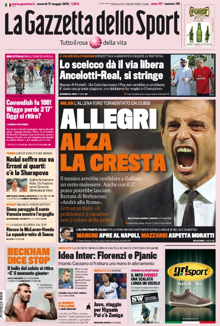 La notizia bomba questa mattina arriva direttamente dall’ex Presidente del Consiglio Silvio Berlusconi: il prossimo anno Allegri andrà alla Roma. Non su tutti i giornali però la notizia viene trattata in maniera uguale. C’è chi, come il Corriere dello Sport e Tuttosport lo danno per certo, chi invece, come la Gazzetta, afferma che si è trattato solo di una battuta del Cavaliere e che il tecnico rimarrà anche la prossima stagione. Secondo i ben informati sarebbe stato proprio l’allenatore a mostrare il suo disagio a Galliani e a chiedere di essere lasciato libero anche in caso di terzo posto.