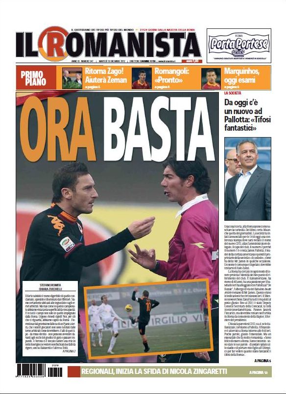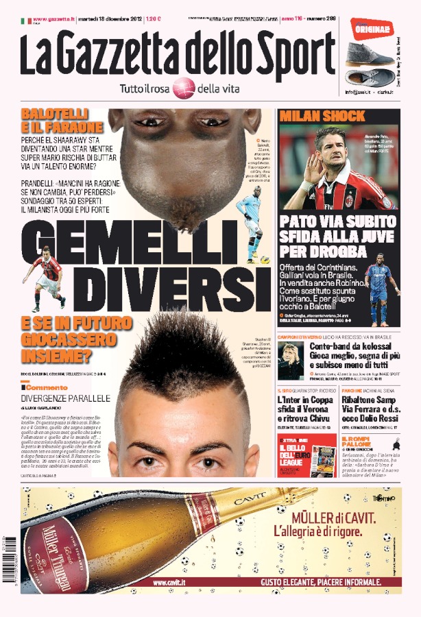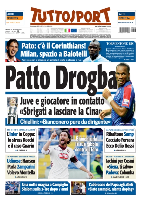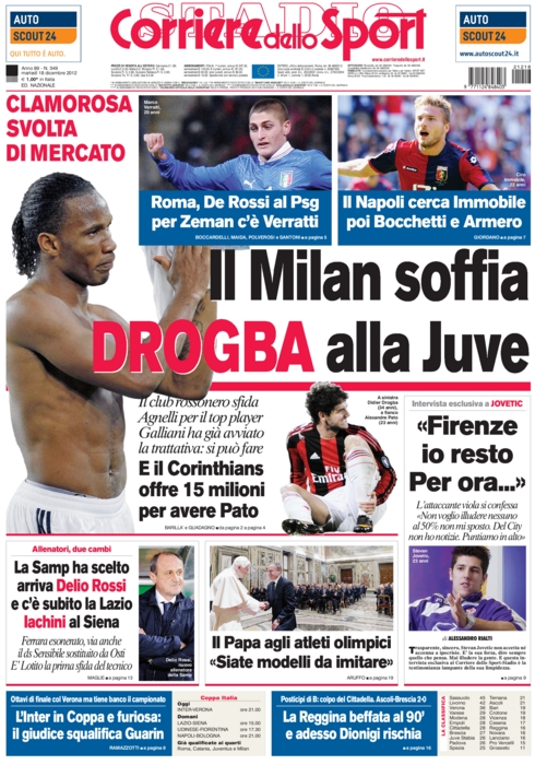La Gazzetta ci va più cauta e parla solo dell’inserimento nella trattativa dei rossoneri, i quali però sarebbero interessati anche a Balotelli, mentre per Tuttosport ci sarebbe la pressione della società bianconera affinché Drogba si sbrighi a lasciare la Cina. Ma attenzione ad un altro caso che potrebbe durare ancora a lungo: il Corinthians si è fatto avanti per Pato. Per ora ha offerto poco, 15 milioni, ma in futuro non si sa mai. Chiudiamo come sempre con il Romanista che recrimina ancora per l’arbitraggio di Bergonzi di domenica scorsa titolando “Ora Basta”. I giallorossi sono stanchi dei torti arbitrali, ed in effetti contro il Chievo ne hanno subito più di uno. Vediamo le prime pagine dei quotidiani di oggi.
