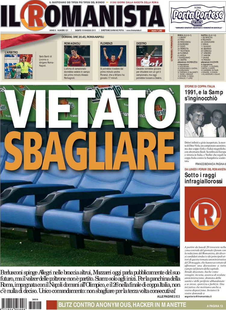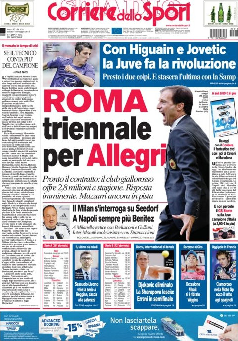 Ma sono ancora gli allenatori ad accendere il dibattito di oggi. Secondo il Corriere dello Sport la Roma avrebbe già offerto un triennale da 2,8 milioni a stagione ad Allegri, e probabilmente dopo l’ultima partita di campionato avremo la risposta del tecnico. Dopotutto, come sottolinea il Romanista, dopo aver sbagliato con Luis Enrique e con Zeman, è vietato sbagliare tecnico per la terza volta di fila.