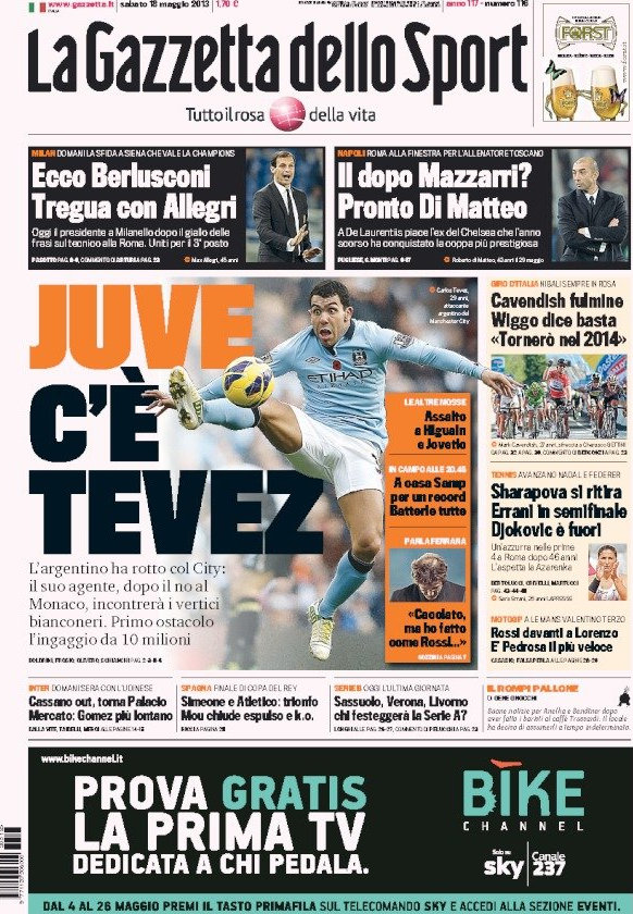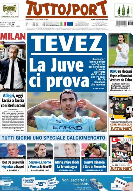 Carlos Tevez debutta sulle prime pagine dei giornali sportivi, candidandosi a tormentone dell’estate un po’ come lo è stato nel gennaio scorso Mario Balotelli. Un altro ex Manchester City potrebbe presto sbarcare in Italia, ma con la maglia della Juve, come spiegano Gazzetta e Tuttosport che si dicono convinte della fattibilità dell’operazione dato che Carlitos ha una qualità straordinaria e costa la metà di Jovetic.