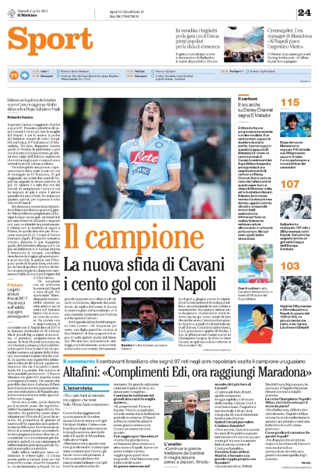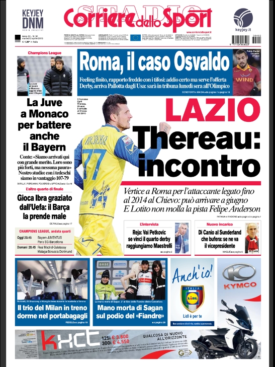 È certamente la Juventus a meritarsi le prime pagine di oggi, ma i bianconeri non sono gli unici a far parlare di sé. Tra le altre squadre torna a farsi sentire il Napoli, ed in particolare a tenere banco è ancora una volta Cavani, con l’ambiente che cerca di convincerlo a rimanere un altro anno per battere i record di Maradona. Ma si parla anche delle romane, con i giallorossi che cercano di uscire dalla crisi e riprendono ad allenarsi in un’atmosfera di rivincita, mentre i biancazzurri pensano alla prossima stagione e starebbero cercando di ingaggiare Thereau. Infine diamo uno sguardo all’estero dove continua a tenere banco il caso-Di Canio ed in cui oggi si discute di un’altra grande sfida di Champions League, quella tra il PSG di Ibrahimovic ed il Barcellona di Lionel Messi.