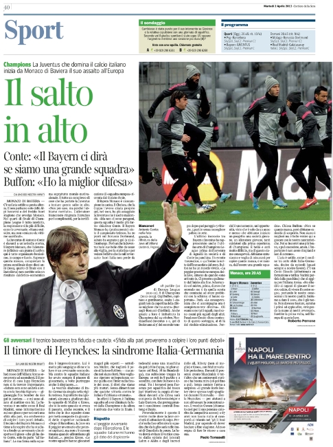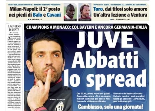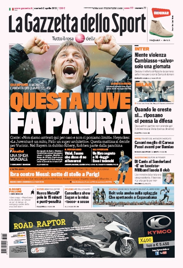 Tutti gli occhi oggi sono puntati sull’Allianz Arena dove questa sera si giocherà la super sfida tra Juventus e Bayern Monaco. Un po’ tutti i giornali sportivi italiani si dividono tra incoraggiamenti e analisi della partita, con la frasi che ricorrono più spesso che riguardano il fatto che non sono extraterrestri (nonostante i 9 gol rifilati all’Amburgo 3 giorni fa) e che in qualche modo si possono battere.