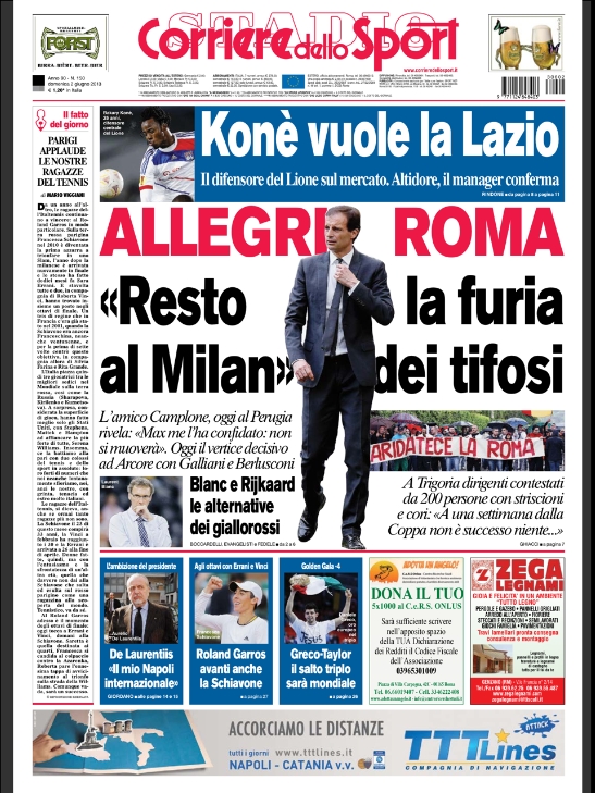Questa sera Berlusconi dovrebbe incontrare il suo attuale allenatore, a scanso di ulteriori rinvii, e la società della Roma è alla finestra. Se arrivassero ulteriori rinvii però, gli americani hanno deciso di puntare su altri tecnici visto che anche i tifosi cominciano a spazientirsi. Tra le altre notizie spiccano i 100 punti raggiunti in classifica dal Barcellona, l’addio di Mourinho al Real per la firma con il Chelsea, e la maxi offerta del Barça proprio ai Blues: 40 milioni di sterline per la coppia Luiz-Ivanovic. Questo ed altro nelle prime pagine di oggi.