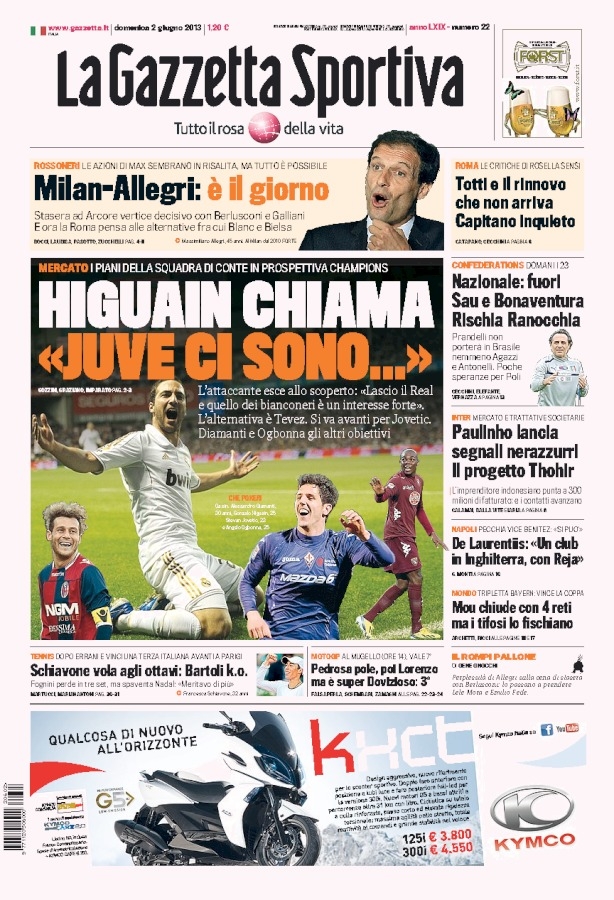 Il mercato della Juventus è ad una svolta. Almeno secondo i principali giornali sportivi italiani infatti, Higuain (che ieri ha annunciato l’addio al Real) sarebbe pronto a firmare per la Juve. Tutti sanno però che non è tanto questo il problema quanto l’accordo tra le società, ma almeno secondo i giornali nostrani dovremmo essere in dirittura d’arrivo. Oggi inoltre è il giorno di Allegri.
