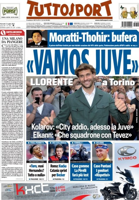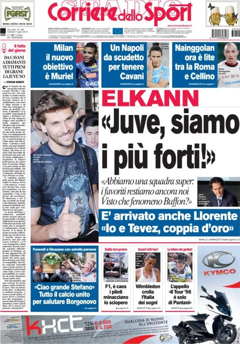 La Juventus mostra i muscoli e si prende tutte le prime pagine di oggi. L’occasione è la presentazione ufficiale di Llorente che già parla di vittorie possibili al fianco di Tevez. Un po’ su tutti i giornali si suonano violini per la Juve che a questi due nuovi acquisti, secondo Tuttosport, potrebbe presto affiancarne un terzo, Kolarov. E perché no, mettere a segno un poker con Ogbonna.