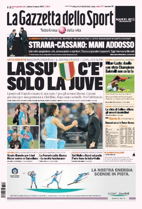 Dopo l’1-1 che in fin dei conti non cambia nulla, lo sguardo si sposta verso partite che invece potrebbero contar molto come Milan-Lazio di stasera e Catania-Inter di domani, due sfide dal sapore europeo che se non valgono un’intera stagione, poco ci manca. A far scalpore semmai oggi è la lite tra Cassano e Stramaccioni, con i due che sono arrivati quasi alle mani, rivelata dalla Gazzetta dello Sport. Vi faremo sapere di più in giornata. La Roma invece dà la caccia all’Europa e sa che se non vince oggi contro il Genoa il suo cammino diventa molto complicato. Andiamo dunque a vedere le prime pagine di oggi.