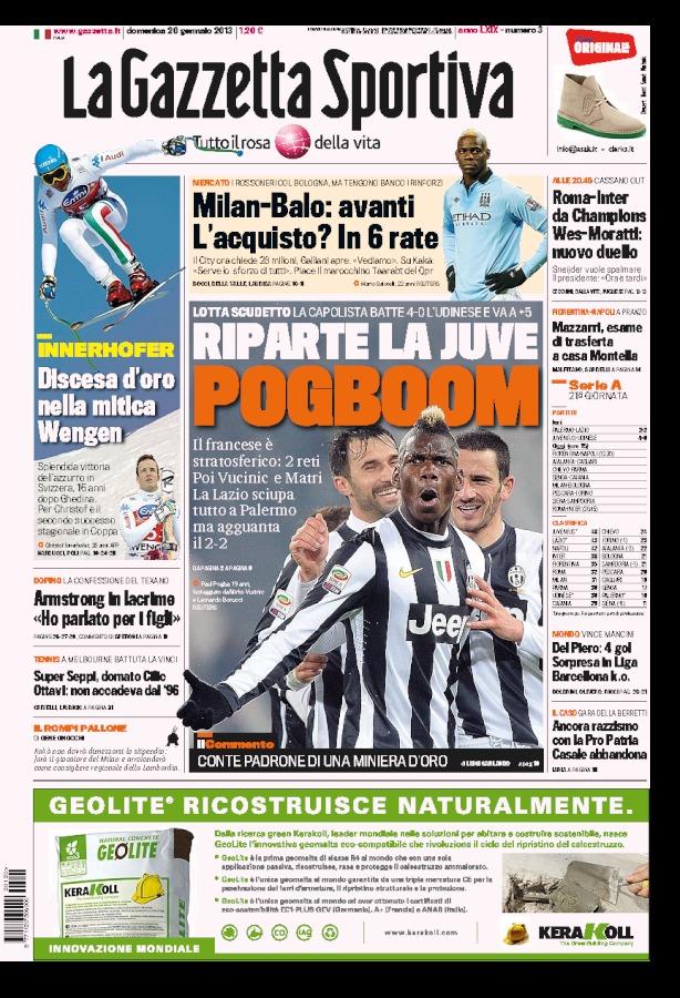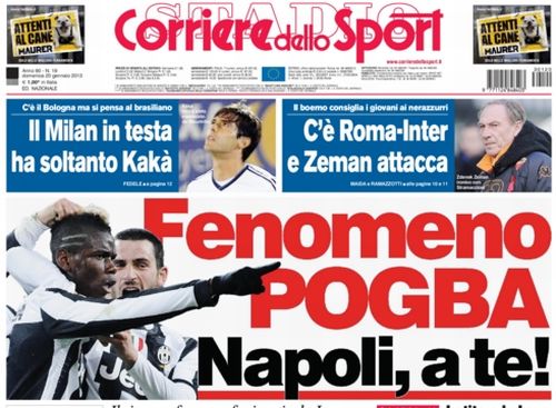 Il fenomeno Pogba irrompe sulla Serie A, e sui giornali italiani. Tutte le prime pagine sono dedicate a lui ed alla grandissima doppietta segnata ieri sera. La Juve è uscita dalla crisi, ed ora la palla, come sottolineano in molti, passa al Napoli che dopo il pareggio di ieri della Lazio ha l’occasione di tornare seconda da sola. Ma ci sono anche altri temi nella giornata calcistica.