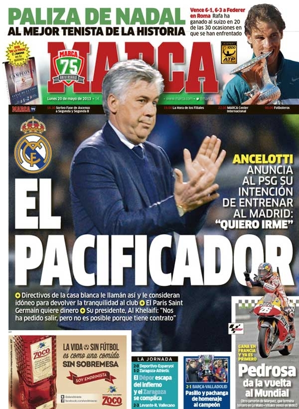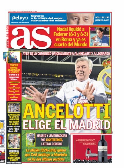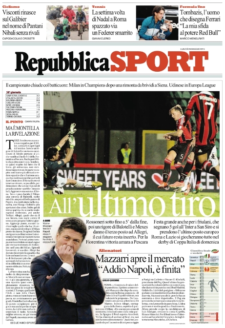 I giornali italiani si dividono oggi tra Milan e Napoli. Sì perché se da un lato c’è da commentare l’assurda partita di ieri, con tanto di probabile esonero di Allegri, dall’altro in quel di Napoli fa rumore l’addio di Mazzarri che saluta la curva tramite Twitter. Il valzer degli allenatori va anche oltre confine e così oggi tiene banco il braccio di ferro tra Ancelotti ed Al-Khelaifi, il presidente del PSG, visto che il tecnico vuole andare al Real Madrid ma lo sceicco non lo molla.