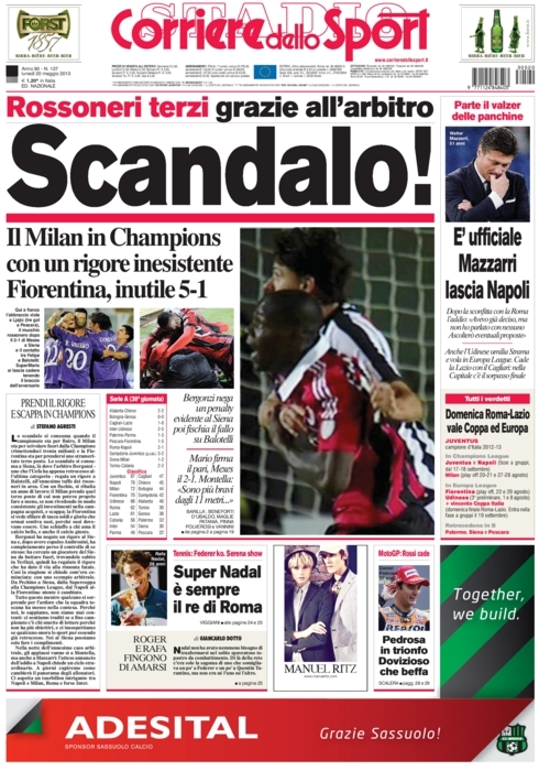 Si è chiuso col botto il campionato, e non soltanto quello italiano. Nella serata di ieri ne sono successe davvero di tutti i colori, tanto che questa mattina i giornali sportivi sono letteralmente impazziti. Ma andiamo con ordine e partiamo con chi fa più rumore, ovvero il Corriere dello Sport sul rigore che ha dato il via alla rimonta del Milan. Il giornale romano grida allo scandalo, parlando di rigore inesistente. La moviola ci dirà se ha ragione, ma certo è che un’apertura così eclatante non ce la ricordavamo da tanto tempo.