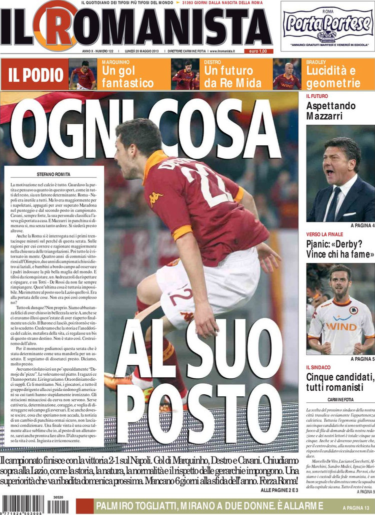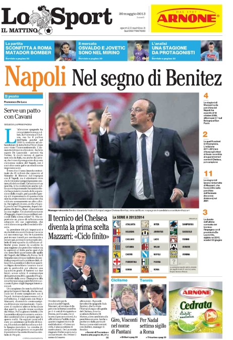 Tra i temi di contorno ci sono il probabile approdo di Benitez in terra campana, l’importanza che assume la finale di Coppa Italia dato che entrambe le romane sono rimaste fuori dalla zona Europa League ed ora devono assolutamente vincere per potersi qualificare, ma anche gli insulti di Diamanti a Borriello che potrebbero costargli la nazionale. E che dire del mercato? Insomma, c’è davvero tanto oggi, quindi vi lasciamo alle prime pagine dei giornali.